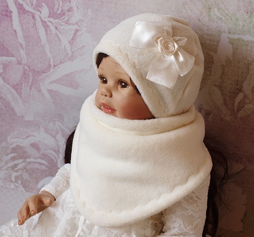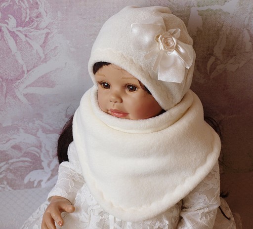 Mamy zaszczyt zaprezentować Państwu śliczny zestaw czapeczkę i chustę pochodzącą naszej pracowni. Czapeczka oraz chusta wykonane są z grubego i mięciutkiego polarku w kolorze ecru. Czapeczka przyozdobiona jest kokardką z różyczką i ma wszytą z tyłu gumkę dzięki której łatwiej dopasowuje się do główki dziecka. Chusta zapinana z tyłu na rzep. Ubranko jest bardzo cieplutkie i wygodne. Zestaw jest elegancki a maluszek uroczo będzie w nim wyglądał.