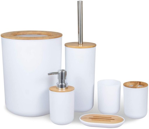 Akcesoria łazienkowe Timor komplet 6 sztuk biały Przeznaczenie: łazienka | Kolory: biały, bambus naturalny Idealny zestaw akcesoriów do łazienki. W skład kompletu wchodzi sześć elementów: dozownik mydła, kubek na szczoteczki do zębów kosz na śmieci, kubek łazienkowy do płukania ust, mydelniczka, szczotka do WC, pojemnik na śmieci. Starannie wykonany, ma opływowe kształty, dzięki czemu nie tylko wpisuje się w najnowsze trendy wnętrzarskie i bardzo łatwo utrzymać go w czystości. Jasne, ozdobne elementy wykonano z naturalnego bambusa. Dzięki temu bardzo łatwo będzie znaleźć inne, pasujące dodatki w tym kolorze. Bambus jest obecnie bardzo popularnym i chętnie wybieranym materiałem przy urządzaniu nowoczesnych i modnych wnętrz. Sprawdzi się doskonale w stylu loftowym, nowoczesnym, klasycznym. Zawartość zestawu: dozownik mydła kosz na śmieci kubek łazienkowy do płukania ust kubek na szczoteczki do zębów mydelniczka szczotka do WC Specyfikacja: materiał pojemników: PP (polipropylen) materiał pokrywek: 100% bambus waga zestawu: 1,1 kg przeznaczenie: łazienka Wymiary: kubek na szczoteczki: 7,5x11 cm kubek łazienkowy: 7,5x10,5 cm mydelniczka: 13,5x8,5 cm kosz na śmieci: 19,5x26 cm stojak ze szczotką wc: 10x36 cm dozownik mydła: 7,5x16,5 cm Informacje dodatkowe Przedstawione kolory należy traktować poglądowo - mogą odbiegać od rzeczywistych ze względu na różne ustawienia monitorów oraz proces obróbki zdjęć. Rzeczywiste wymiary mogą się różnić od podanych wyżej. Tolerancja błędów może wynosić +/- 5%. Producent: Gockowiak Kod EAN: 324905MG Kolor: biały, naturalne drewno Materiał: tworzywo, bambus Ilość elementów: 6
