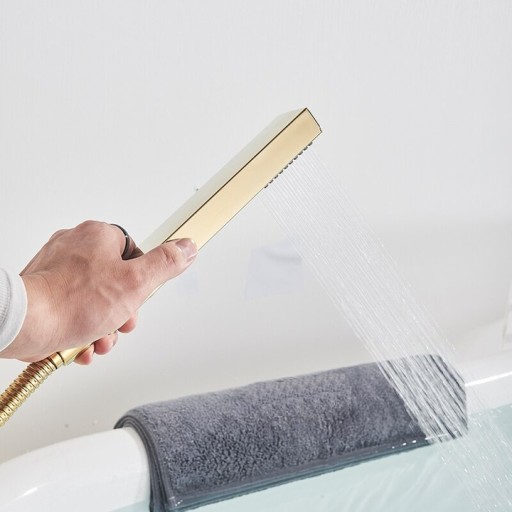 Stylowa i nowoczesna bateria wannowa wolnostojąca z efektem wodospadu - wersja z mosiężną słuchawką prysznicową