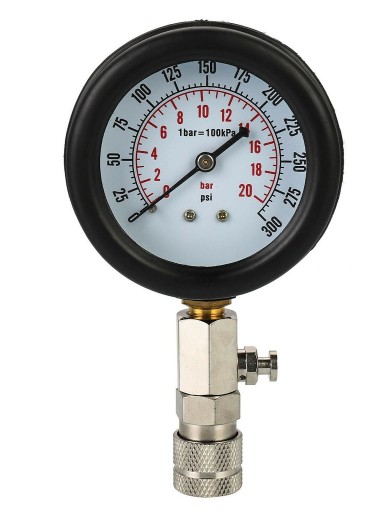 Miernik ciśnienia z podwójną podziałką bar i PSI wyposażony w zawór kontrolny do celów kontrolnych.