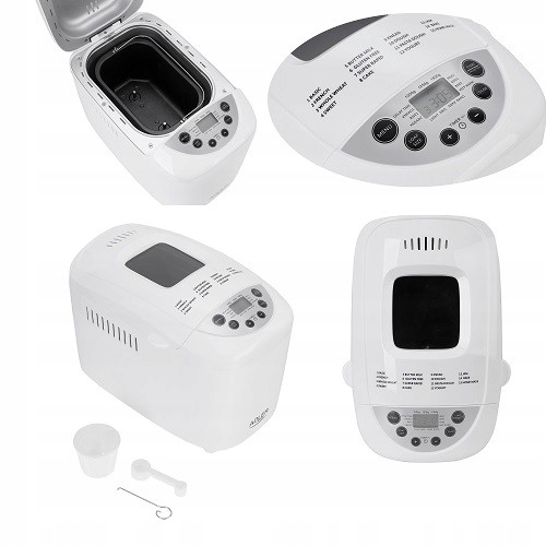 Maszyna do wypieku chleba wyposażona jest w dwa mieszadła, co zapewnia dokładne połączenie składników. Liczne udogodnienia sprawiają, że korzystanie z tego urządzenia to sama przyjemność! Istnieje możliwość wyboru wielkości bochenka (od 750 do 1250g) oraz wyboru koloru skórki, czyli stopnia przypieczenia chleba. Wewnątrz znajduje się wyjmowana forma pokryta warstwą ułatwiającą wyjmowanie upieczonego już bochenka. Dodatkowe funkcje jak podtrzymywanie temperatury czy opóźniony start pozwalają kontrolować przebieg pieczenia. W pokrywie znajduje się okienko, przez które można obserwować proces wypieku. Co więcej urządzenie ma wyświetlacz LCD oraz przyciski w łatwo dostępnym miejscu, dzięki czemu korzystanie z tego urządzenia jest naprawdę intuicyjne!