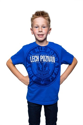 Bawłniana, niebeiska koszulka z dużą grafiką pieczęci, w którą wpisano hasło "Nigdy się nie poddawaj" oraz herb Lecha Poznań.