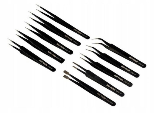 Zestaw dziesięciu precyzyjnych pęset dla elektroniki. Zostały opracowane z antymagnetycznych, antystatycznych, odpornych na kwas i rdze materiałów.