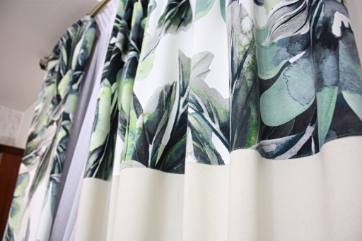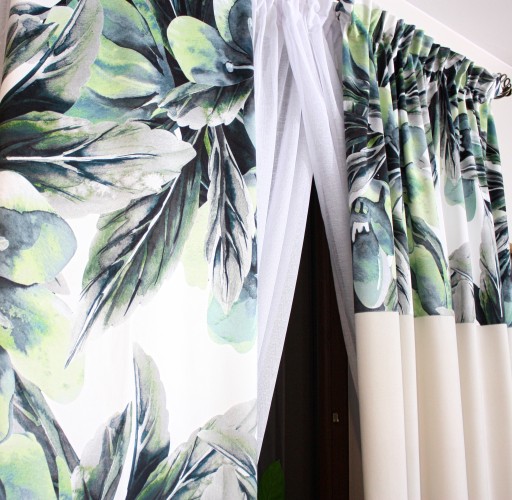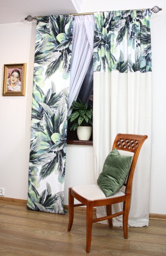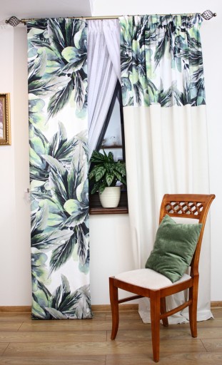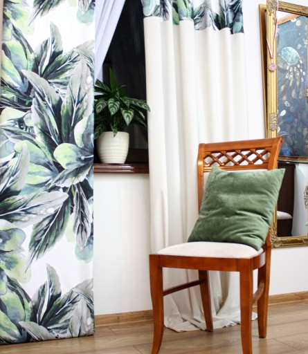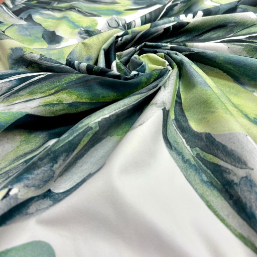 Tkanina z drukowanym wzorem kwiatowym na białym tle, kwiaty są duże w kolorach spokojnej zieleni , rozmieszczone losowo, wyglądają jak dzieła sztuki . Materiał doskonale nadaje się do szycia zasłon, poszewek, obrusów czy nakładek na stół .