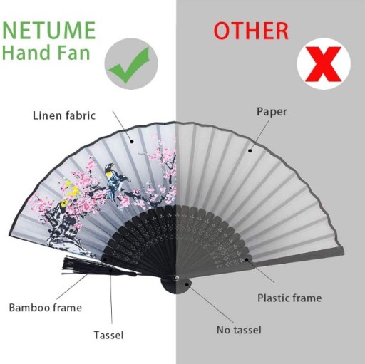 - Materiał - ręczne składane wachlarze wykonane są z jedwabnej tkaniny i bambusa, mają wydrążone ramy z kompaktową kombinacją, która zapewnia silny wiatr. Dzięki bezpiecznej i nieszkodliwej bambusowej ramie i uchwytowi wachlarza możesz cieszyć się naturalnym uczuciem bryzy.