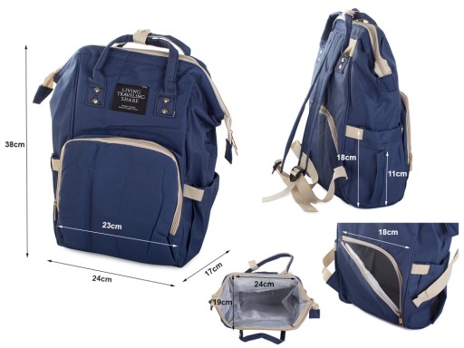 Plecak może spełniać również rolę torby do trzymania w ręku. Można również przymocować go do rączki od wózka. Posiada sztywne plecy oraz regulowane szelki. Wykonany został z tkaniny odpornej na wilgoć.