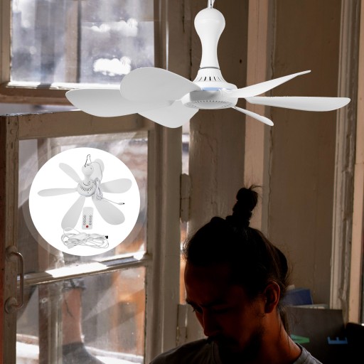 Mały wentylator sufitowy jest idealny na upalne lato i bezwietrzną pogodę, nadaje się również do łóżka lub namiotu kempingowego na zewnątrz.