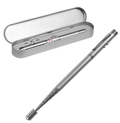 Praktyczny prezent w postaci metalowego długopisu z klasycznym wskaźnikiem teleskopowym, wskaźnikiem laserowym i latarką LED. Zestaw pakowany w srebrne opakowanie upominkowe. Wkład w kolorze niebieskim. Dołączone baterie 3 x LR41, latarka.