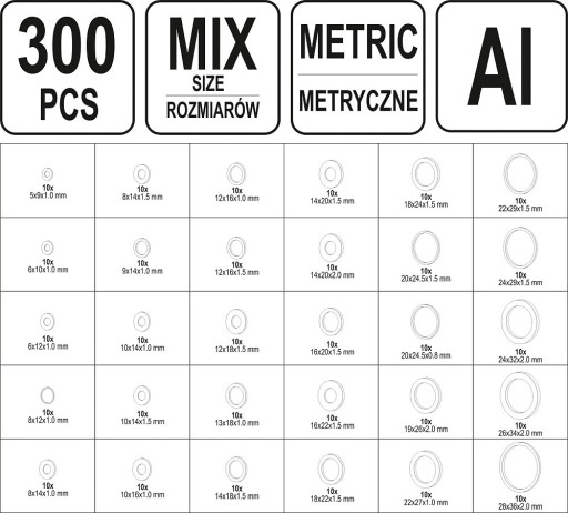 Zestaw 300 sztuk podkładek aluminiowych pod korki spustowe oleju. Zestaw zawiera rozmiary 5x9x1.0 mm do 28x36x2.0 mm. Całość umieszczono w wygodnym opakowaniu typu "sortownik".