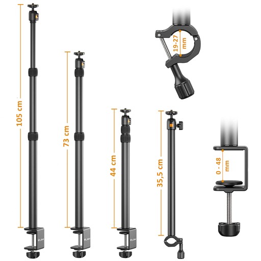 Statyw ma teleskopową (3-segmentową) główną kolumnę, co oznacza, że możesz łatwo dostosować jego wysokość od 44 do 105 cm.