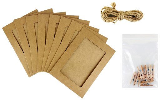 Zestaw 8 kraftowych ramek na zdjęcia ze sznureczkiem i klamerkami Beniamin