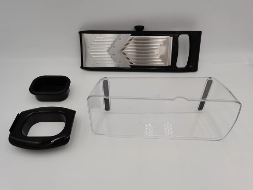 - W zestawie pojemnik na starte warzywa, co ułatwia przechowywanie i przenoszenie pokrojonych produktów.