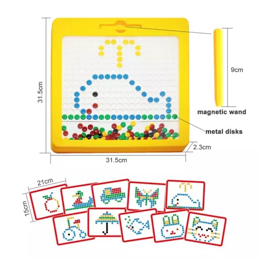Przy pomocy specjalnego magnetycznego "pisaka" Dziecko ma za zadanie przenosić kolorowe "pchełki" z miejsca na miejsce i stworzyć obrazek z instrukcji lub swoje własne dzieło. Tablica magnetyczna na której można tworzyć obrazy za pomocą magnetycznych pchełek rozbudzi ciekawość dziecka i poruszy jego wyobraźnię. Proces tworzenia zajmuje trochę czasu i wymaga nieco precyzji dlatego tablica będzie doskonałym narzędziem do pracy nad cierpliwością.