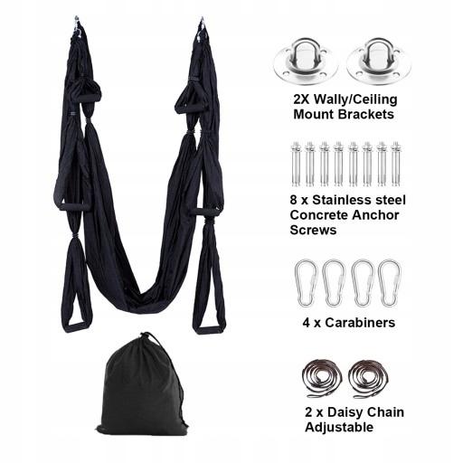 3. Łatwa instalacja i wygodne przechowywanie. Zestaw huśtawki Aerial Yoga zawiera 1 x hamak do jogi, 4 x zamek ze stali nierdzewnej, 2 x wieszak ze stali nierdzewnej, 8 x śruby ze stali nierdzewnej, 2 x przedłużki, wszystkie niezbędne części i bardzo łatwy w montażu. Mocowanie można zainstalować w kilka minut. Również ten powietrzny hamak do jogi jest wyposażony w torbę do przechowywania, którą można przechowywać po zakończeniu używania. Wygodne przechowywanie i łatwe w montażu i demontażu.