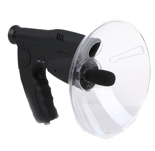 Antena mikrofonu zbiera dźwięki i skupia je w centralnym punkcie, gdzie znajduje się niezwykle czuły mikrofon.