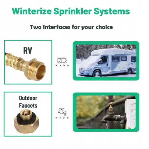 3. Kompatybilne modele: Kompatybilne ze standardowymi gwintami węża ogrodowego i szybkozłączami sprężarki powietrza powszechnymi w Ameryce Północnej. Zapewnia ochronę przed zimnem dla systemów zraszaczy trawnika, kranów i rur, aby zapobiec uszkodzeniom spowodowanym zamarzaniem.