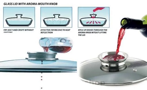 Zestaw posiada pokrywki szklane z uchwytem Aroma Knob w którym umieszczono dozownik oleju, dzięki któremu podczas gotowania lub duszenia można podawać olej lub płynne przyprawy.