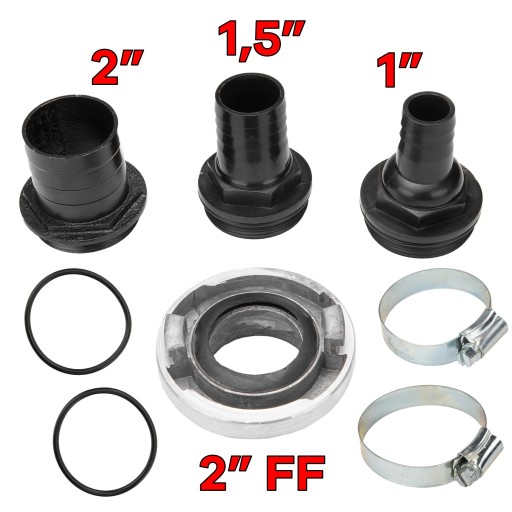 Do pompy dołączone są 3 redukcje (2" , 1,5" , 1"), które pozwalają na zamontowanie węży o różnych średnicach.