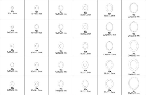 Zestaw zawiera rozmiary 5x9x1.0 mm do 28x36x2.0 mm.