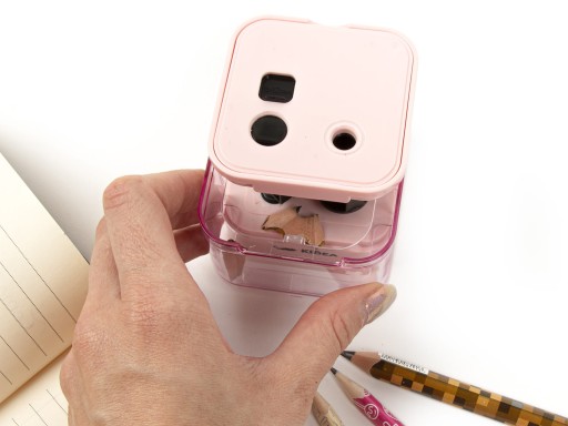 W temperówce zamontowano czujnik bezpieczeństwa, dzięki któremu temperówka nie będzie ostrzyć, gdy wyciągniemy pojemnik na strużyny.