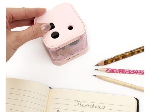 Pastelowy, różowy odcień i wyjątkowy design temperówki świetnie prezentuje się na biurku.
