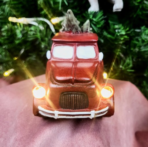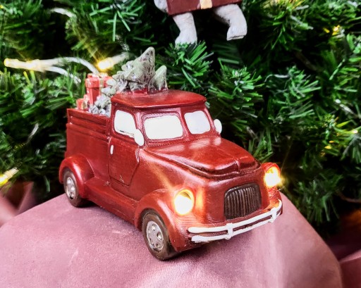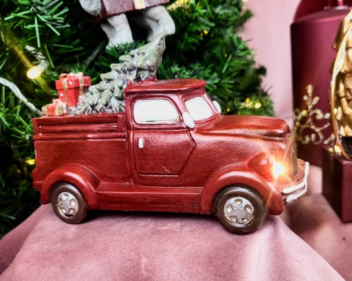 Świąteczna figurka bordowego samochodu z choinką i prezentami oraz wbudowanym oświetleniem ledowym będzie stanowił wyjątkowe uzupełnienie bożonarodzeniowych dekoracji. Dzięki delikatnemu oświetleniu z lamp stworzy przytulną atmosferę na okres zimowy i nie tylko.