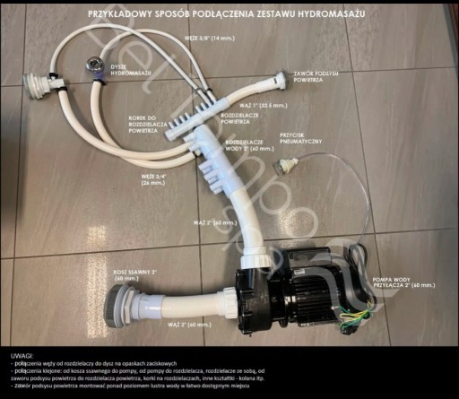 Konieczne jest wyprowadzenie wężyków podsysu powietrza od dysz ponad poziom lustra wody w wannie/balii. Można skolektorować je w rozdzielacz i podłączyć do zaworu regulacji powietrza.