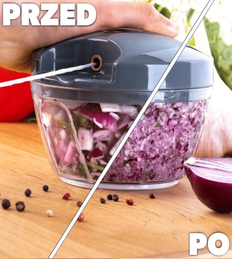 Wygodny i prosty w obsłudze, wystarczy umieścić produkt w pojemniku, zamknąć przykrywką i pociągnąć za uchwyt na sznurku. Obracające się ostrza wewnątrz krajacza, natychmiast rozdrobnią nasze jedzenie.
