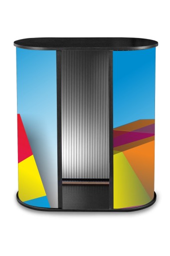 Duża Trybunka Reklamowa to system z lekkiego poliwęglanu oraz blatów z płyty drewnianej w okleinie czarnej, który pozwoli stworzyć idealne stoisko niezależnie od miejsca i powierzchni. Dzięki zastosowaniu specjalnego materiału grafika jest sztywna a jednocześnie idealnie przylega do stelaża