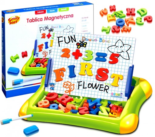 Podczas zabawy dziecko uczy się i rozwija wiele zdolności. Tablica jest wykonana z plastiku, dzięki temu łatwo ją wyczyścisz. Zabawka pełni także funkcję pojemnika do przechowywania wszystkich elementów zawartych w zestawie. Po wyjęciu zabawki należy postępować zgodnie z instrukcją na pudełku. Kolorowe literki i cyferki mają magnesy. Dziecko może układać je na tablicy, tworząc w ten sposób pierwsze słowa i uczyć się prostych działań matematycznych. Na tablicy można również rysować i pisać dołączonym do zestawu pisakiem, a po skończonej zabawie zetrzeć wszystko gąbeczką i rozpocząć wszystko od nowa.