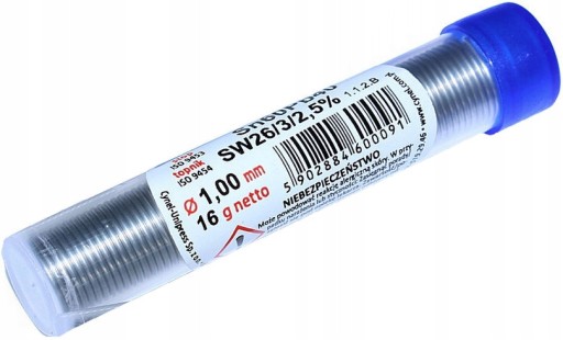 Spoiwo lutownicze z topnikiem wyprodukowane w pierwszym wytopie cyny i ołowiu zgodnie z normą PN EN 29453:2000, w ciągłym procesie odlewania bez dostępu powietrza, następnie wyciskane, co zapewnia eliminację występowania tlenków. Spoiwo grubości 0,5 mm i wadze 100 g, o zawartości cyny w produkcie w granicach: 59,5% do 60,5%, i temperaturze topienia w przedziale: 183°C do 190°C. Topnik SW26 wykonany jest na bazie kalafonii oraz organicznego aktywatora halogenowego, który po lutowaniu zostaje "uwiązany" w kalafonii, przez co nie ma bezpośredniego kontaktu z lutem i nie powoduje korozji, a także ułatwia topnienie i zwiększa płynność lutu. Spoiwo lutownicze ma zastosowanie głównie w przemyśle elektronicznym, do produkcji standardowych urządzeń i podzespołów elektronicznych, elektrotechnice. Umieszczone w wygodnej fiolce. Charakterystyka: średnica fi 1.00mm długość ok. 3 metry stop cyny i ołowiu Sn60Pb40 drut wielordzeniowy z topnikiem SW26 Spoiwo lutownicze ma zastosowanie głównie w przemyśle elektronicznym, do produkcji standardowych urządzeń i podzespołów elektronicznych, elektrotechnice.