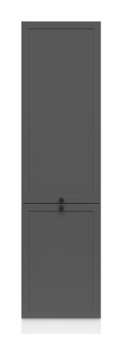 Na wysoką szafkę Junona Line składa się wyjątkowa kolorystyka - biały korpus oraz grafitowe fronty . Charakteru nadaje obramowanie frontów a całości dopełaniają uchwyty w kształcie gałki.
