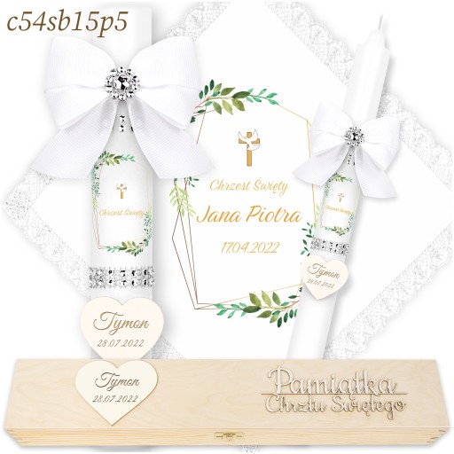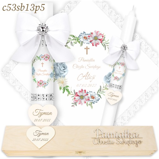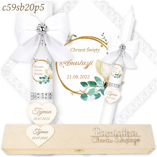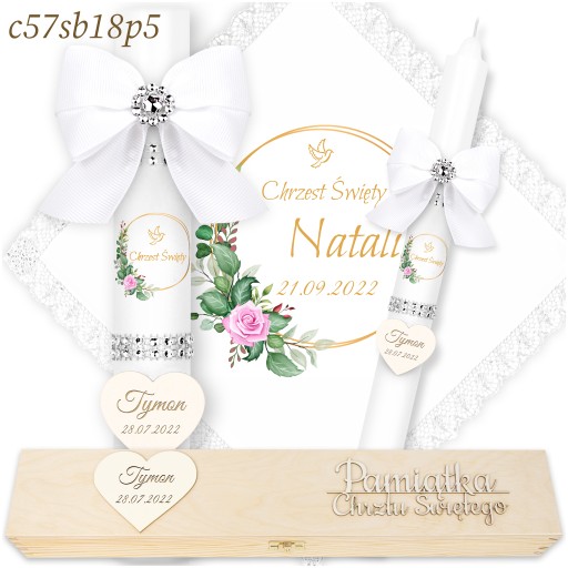 ŚWIECA NA CHRZEST + DREWNIANE PUDEŁKO Imienna Świeca i Szatka do Chrztu