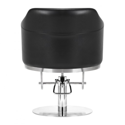 Solidna, okrągła podstawa zapewnia stabilność w trakcie użytkowania. Gładka powierzchnia sprawia, że element ten jest łatwy do utrzymania w czystości. Szerokie siedzisko, wypełnione pianką o odpowiedniej twardości, gwarantuje wysoki komfort użytkowania i wygodę nawet podczas wielogodzinnych zabiegów. Podłokietniki znajdują się na wysokości, która pozwala na prawidłowe ułożenie barków klienta – sprawia to, że nie chowa głowy w ramionach ani się nie garbi – wyraźnie usprawniając zabiegi, w tym strzyżenie. Ułatwia to precyzyjne wykonywanie usług.
