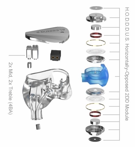 H.O.D.D.D.U.S. (Horizontally Opposed Dual Dynamic Drivers Unit System) wykorzystuje dwa dynamiczne przetworniki 10 mm rozmieszczone blisko i symetrycznie za pomocą drukowanych w 3D modułowych elementów. Komponenty tworzą fizyczny filtr środkowoprzepustowy, składający się z dwóch niezależnych struktur filtrujących i urządzeń tłumiących, ułatwiając w ten sposób regulację akustyczną.