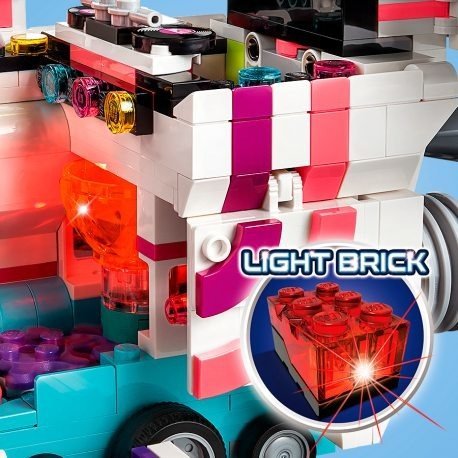 - Autobus imprezowy ma otwieraną kabinę, w której zmieści się figurka Zebera, dwa rozkładane głośniki, świecący klocek LEGO® do oświetlenia obrotowego parkietu oraz składaną kulę dyskotekową z przezroczystych klocków, a w środku znajdują się dwa koktajle i mikrofon. Dodatkowo dach i boki pojazdu można otworzyć, by łatwiej dostać się do środka.