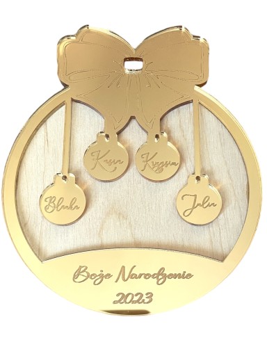 Bombka wykonana jest z plexi w kolorze ZLOTEGO lustra oraz sklejaki w kolorze naturalnym
