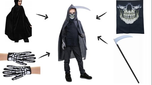 KOSTIUM KOSTUCHA ŚMIERĆ KOŚCI DLA DZIECKA KOSA KOMIN PELERYNA RĘKAWICZKI