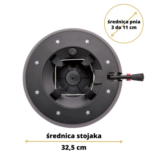- opatentowany mechanizm 4 haków, które zaciskają się na pniu i unieruchamiają choinkę
