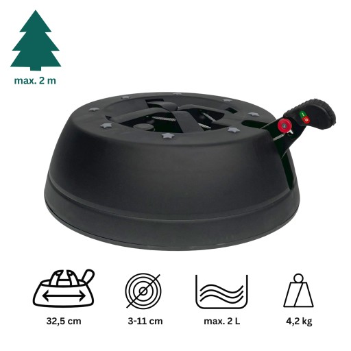 Wytrzymały stojak do żywych choinek Nasz produkt jako jedyny na rynku jest dodatkowo obciążony i ma wagę 4 kg zapewniając realną stabilność choince do 2 metrów. Nie musisz go dodatkowo dociążać (np. kamieniami) czy przywiązywać choinkę do kaloryfera, aby się nie przychyliła. Dodatkowo możesz wlać do niego aż 2 litry wody, co powoduje obciążenie o dodatkowe 2 kg. System 4 haków zaciska pień choinki i w pełni go unieruchamia. Dzięki opatentowanym mechanizmom choinka stoi prosto i nie wywraca się. Haki złapią oraz zacisną pień o średnicy od 3 do 11 cm (czyli wszystkich najpopularniejszych rodzajów drzewek) i tym samym w pełni unieruchamiając choinkę w pionie. Więc nie potrzebujesz narzędzi, aby ciosać i dopasować pień.