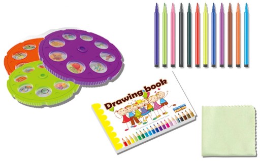 Wspaniały zestaw do rysowania. w zestawie stolik z tablicą suchościeralną, 3 dyski z 24 obrazkami o różnorakiej tematyce,12 kolorowych mazaków oraz książeczka do rysowania.