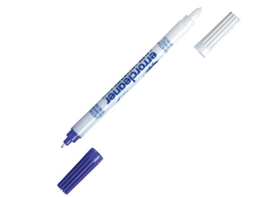 Wymazywacz do atramentu z korektorem, mocne końcówki : stożkowa do precyzyjnego i szerokiego wymazywania oraz cienkopisząca do dokładnej korekcji w miejscu wymazanego tekstu, długotrwałe działanie, zatyczki wentylacyjne, indywidualny kod kreskowy na korpusie, jednostka sprzedaży = pudełko 25 sztuk, produkcja : Fibracolor Włochy, certyfikat CE.