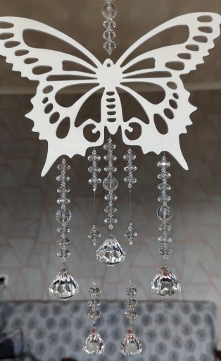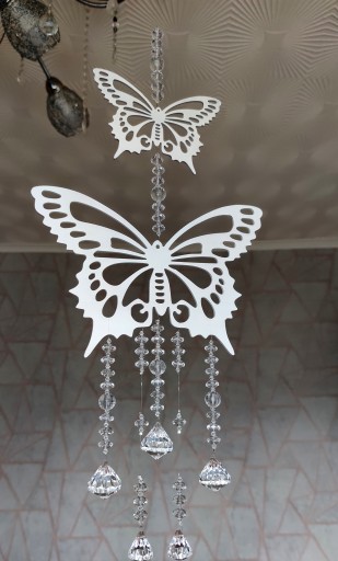 Długość całej ozdoby to 95 cm, długość żyłki z kryształkami na której wiszą motyle 50 cm.