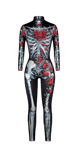 ⭐Jednoczęściowy kostium kościotrupa w kolorze czarnego z białymi i czerwonymi elementami. Dobrze wykonany, zapinany na zamek błyskawiczny. Dzięki naszej propozycji każdy może przemienić się w przerażającą postać z horroru. Ciekawy kostium pozwoli na świetną zabawę podczas Halloween.