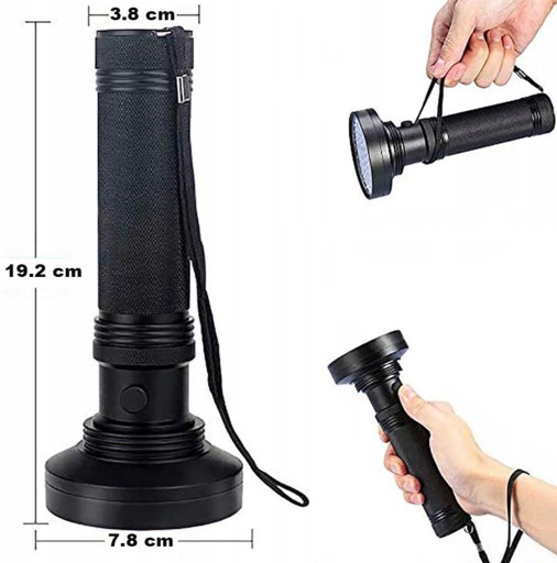 100 LED emituje światło UV o długości 395 nm, aby podkreślić sole i poświatę, dzięki czemu plamy będą widoczne dla ludzkiego oka. Emituje jasne światło i pokrywa większy obszar, ułatwiając dostrzeżenie suchego moczu zwierząt domowych, plam po jedzeniu, skorpionów, pluskiew, praw jazdy, par podróżujących, biżuterii itp.
