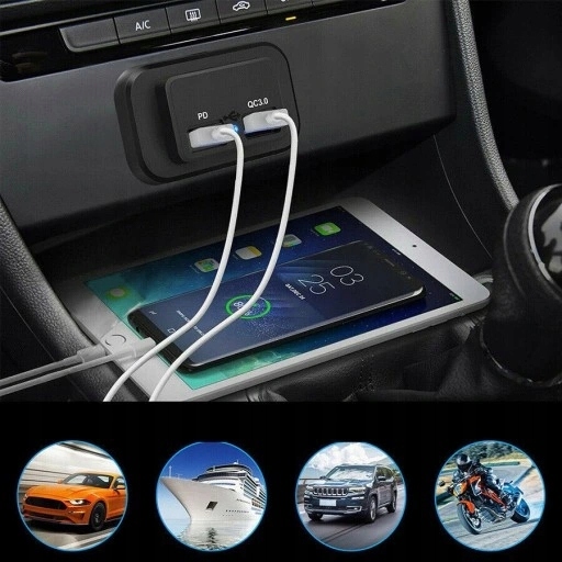 QC 3.0 PD 12V 24V Podwójna ładowarka samochodowa USB typu C Adapter gniazda adaptera Panel wspornika Cechy: - Wykonany z wysokiej jakości materiału, trwały i wytrzymały, odporny na zużycie i korozję, wodoodporny i pyłoszczelny. - Łatwy w instalacji, bez otworów, odpowiedni dla większości pojazdów 12/24 V, samochodów, łodzi i innych. - Szybkie ładowanie USB 3.0, 4 razy szybsze ładowanie urządzeń.Wystarczy 35 minut, aby osiągnąć do 80% pojemności baterii, aby spełnić Twoje wymagania. - Szeroko kompatybilny ze wszystkimi urządzeniami iOS, aby ładować telefony przez cały czas. Dane techniczne: Czarny kolor Materiał: ABS Napięcie wejściowe: 12-24 V Napięcie wyjściowe: 5 V/9 V/12 V; Prąd wyjściowy: PD 18W: 5V-3A/9V-2A/12V-1,5A Kontrola jakości 3.0: 5V-3A/9V-2A/12V-1,5A Moc: 24 W Pakiet zawiera: 1 x panel ładowarki samochodowej opisać: Port USB/type-c PC3.0 obsługuje do 24W (do szybkiego ładowania: należy użyć kabla TYPE-C.) Port Quick Charge 3.0 zapewnia 4x szybsze ładowanie kompatybilnych urządzeń. Naładuj kompatybilne urządzenia do 80% w zaledwie 35 minut. Nylonowy korpus jest skutecznie odporny na zarysowania, a do tego produktu dołączona jest osłona przeciwpyłowa, która skutecznie chroni ładowarkę przed nagłymi zachlapaniami wody i kurzem. Jest przeznaczony do montażu powierzchniowego. Urządzenie można zainstalować na płaskiej powierzchni, nie są wymagane duże otwory, wystarczy mały otwór do wprowadzenia kabla i można je łatwo zainstalować w ciągu 20 minut. Uniwersalne zastosowanie do większości pojazdów 12 V/24 V, samochodów, motocykli, łodzi, kamperów. Wejście: 12 V-24 V, wyjście: 5 V 4,8 A, niebieskie światło jest zawsze włączone po włączeniu zasilania. Naładuj wszystkie urządzenia z systemem iOS. Adapter ładowarki samochodowej ładuje Twoje urządzenie mobilne z maksymalną prędkością obsługiwaną przez Twoje urządzenie.