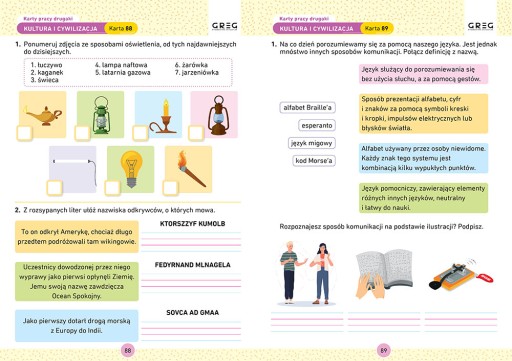 Ćwiczenia językowe doskonalą umiejętności nabyte w poprzednich klasach oraz wprowadzają kolejne formy pisemne, jak plan czy opis. Zadania są atrakcyjne i ciekawe, rozwijają zarówno zasób wiedzy, jak kreatywność, wyobraźnię i logiczne myślenie. Karty posiadają perforację, dzięki czemu łatwo je wyrwać, a kolorystykę dobrano tak, by kserowanie na czarno-białej kopiarce nie powodowało utraty czytelności. Jednocześnie szata graficzna jest bardzo kolorowa, przyjemna dla oka ucznia.