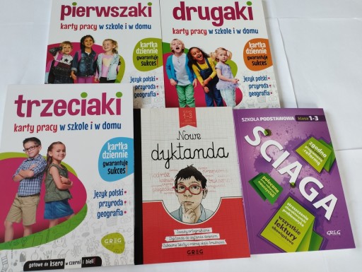 Na tej aukcji oferuję zestaw pięciu pozycji przeznaczonych dla klas 1-3 szkoły podstawowej: Ściąga kl. 1-3, Nowe dyktanda kl. 1-3 oraz Karty pracy w szkole i w domu: PIERWSZAKI, DRUGAKI oraz TRZECIAKI. Wydawnictwo GREG.