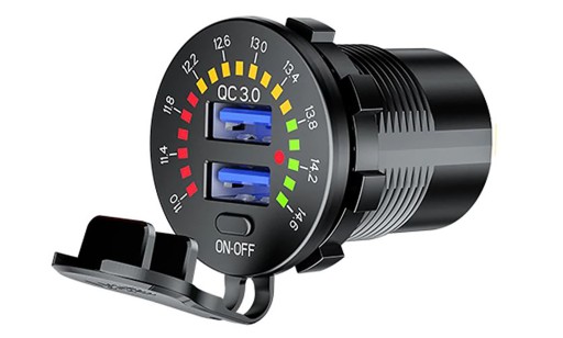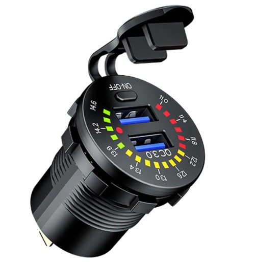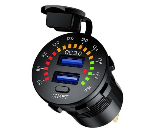 Woltomierz posiada opcję szybkiego ładowania QC 3.0 (sprawdź czy Twój telefon go obsługuje), przycisk on/off oraz przejrzystą i kolorową skalę napięcia pracy.