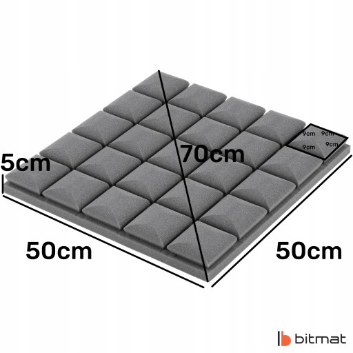 Pianka akustyczna kostka wypukła marki Bitmat zwana także panelem akustycznym jest wykonywana ze spienionego poliuretanu, a jego struktura to otwarte komórki. Zastosowanie odpowiednich stożków doskonale sprawdza się w studiach i pokojach muzycznych/kabinach lektorskich, ponieważ poprawia zrozumiałość mowy i wokalu. Jest to zastosowanie optymalne, które przy stosunkowo niskich kosztach pozwala zapobiegać pogłosowi, poprawia jakość dźwięku w pomieszczeniach mieszkalnych i roboczych, a także tworzy nowoczesny design.